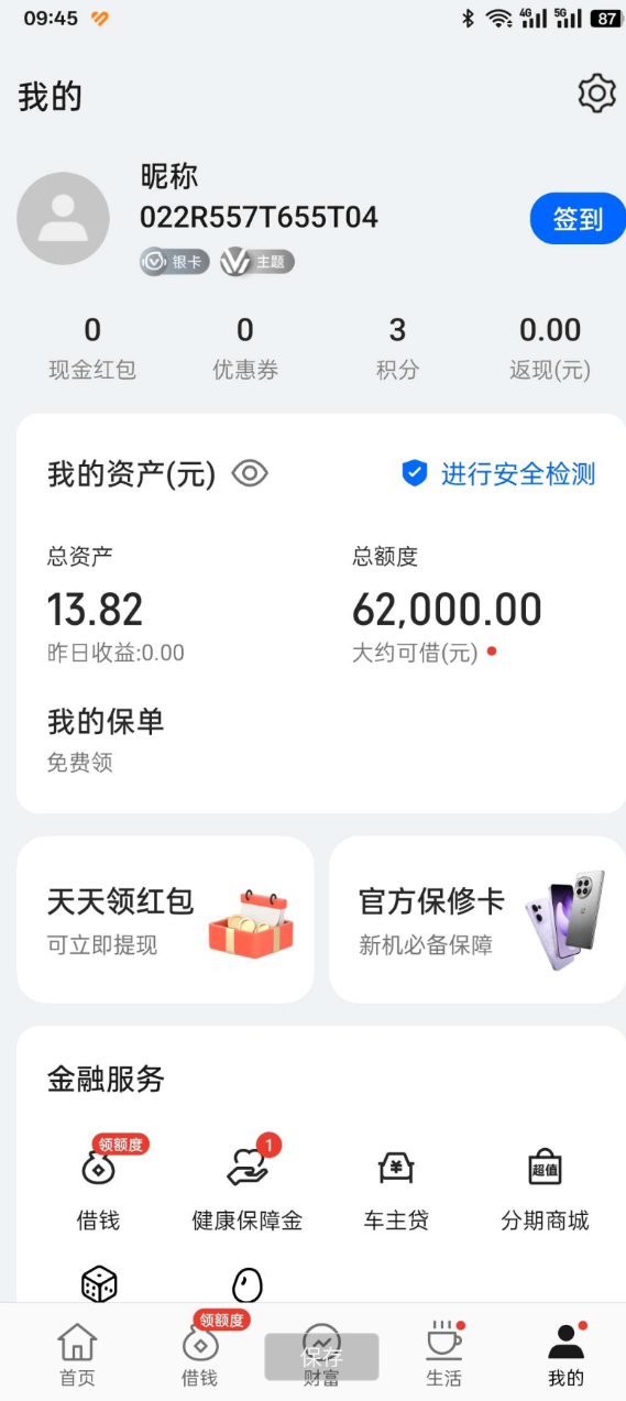 oppo手机,自带应用钱包,点击我的,天天领红包,